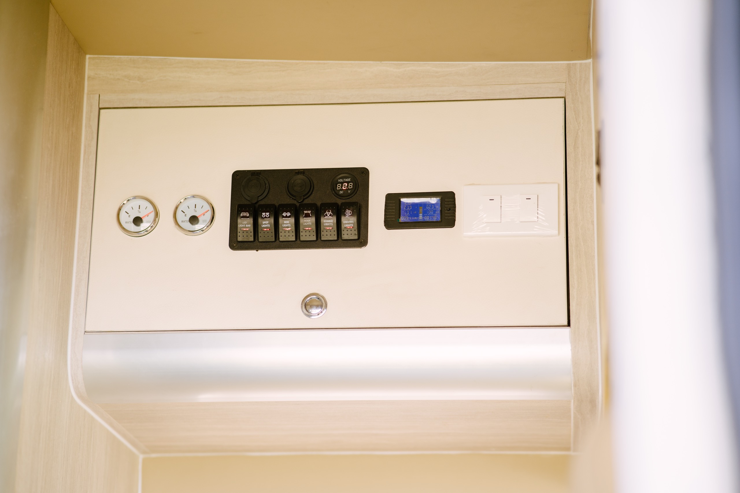 Hệ thống điện gồm pin dung lượng lớn, inverter chuyển đổi nguồn, hỗ trợ điện năng lượng mặt trời và sạc trong quá trình xe di chuyển. Mọi thông số nạp xả, mức pin và tiêu hao đều được hiển thị rõ ràng.