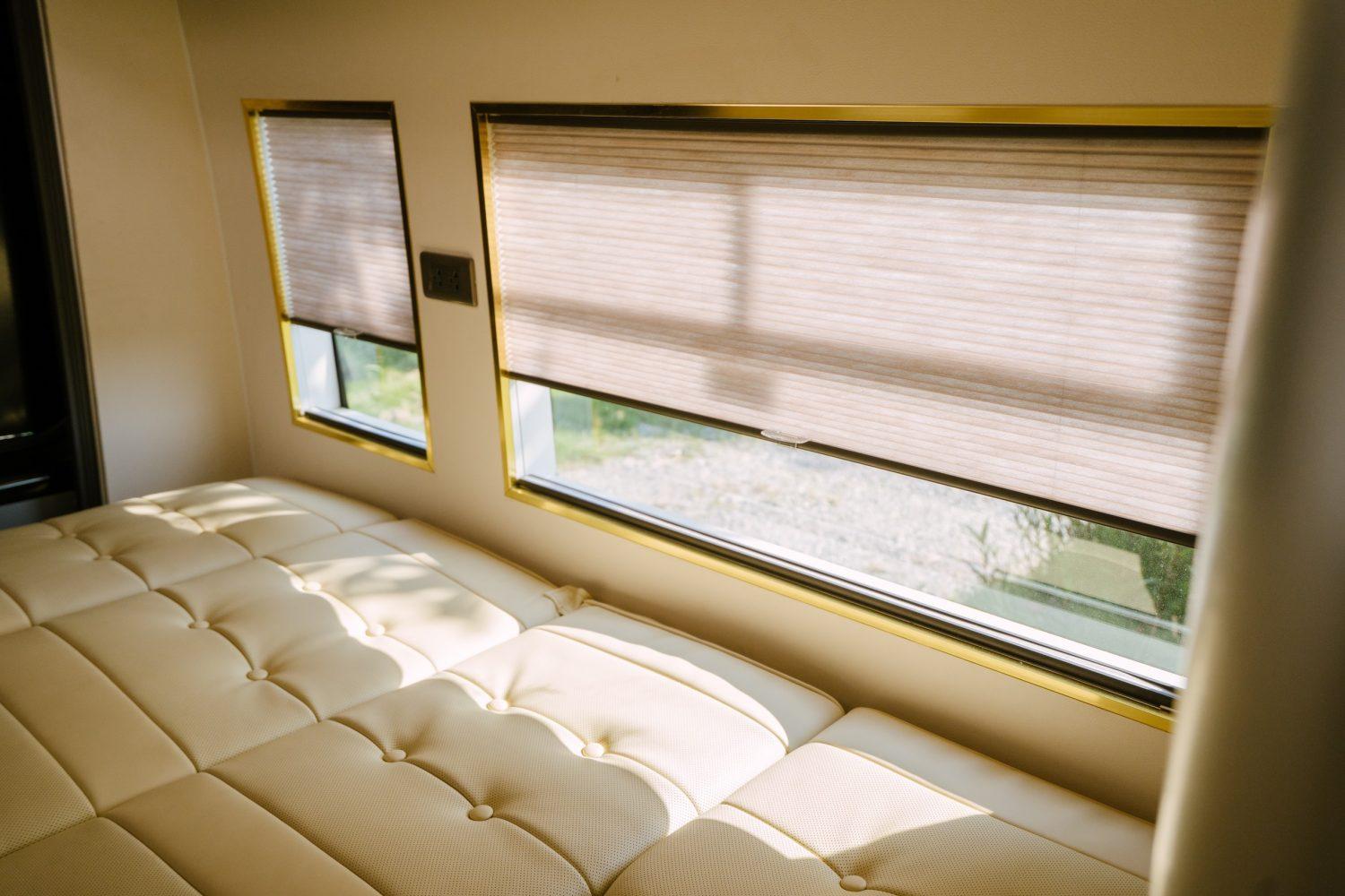 Hệ thống rèm che kín đáo, chống muỗi và đảm bảo riêng tư khi nghỉ ngơi. Các hộc chứa đồ được bố trí dọc trần và phía sau xe, giúp mang theo nhiều vật dụng cá nhân mà vẫn gọn gàng.
